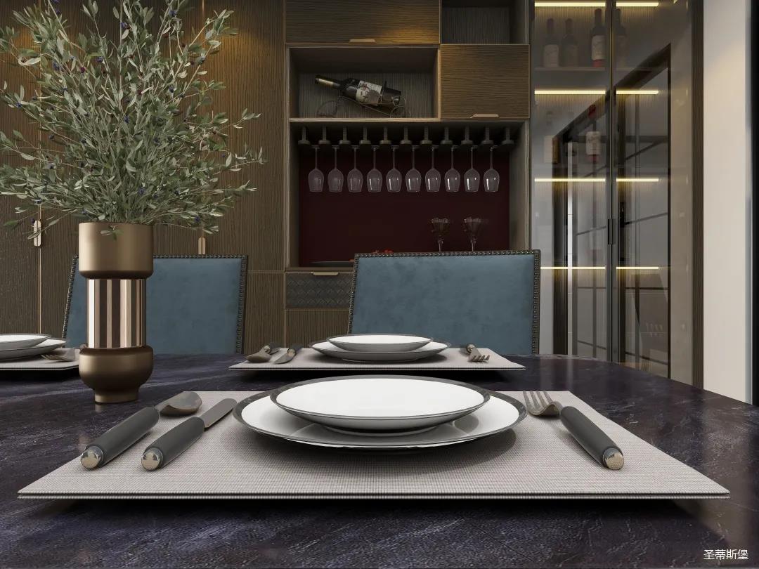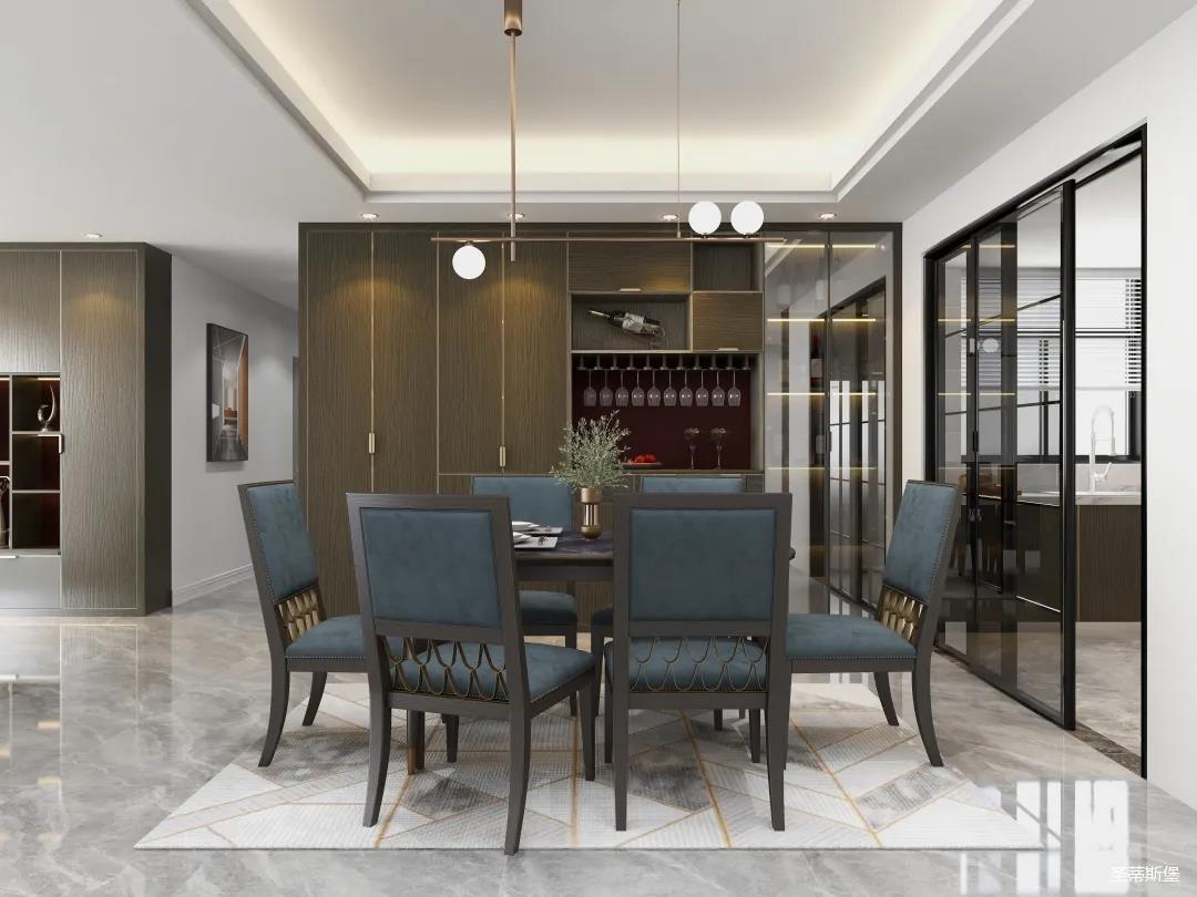 餐厅系统诠释着材质与工艺的质感结合。一字型定制餐边柜,实木饰面细腻自然,让就餐空间成为了高级情调的重点。明暗分区的设计构造,顺势创造了更多的储物惊喜。