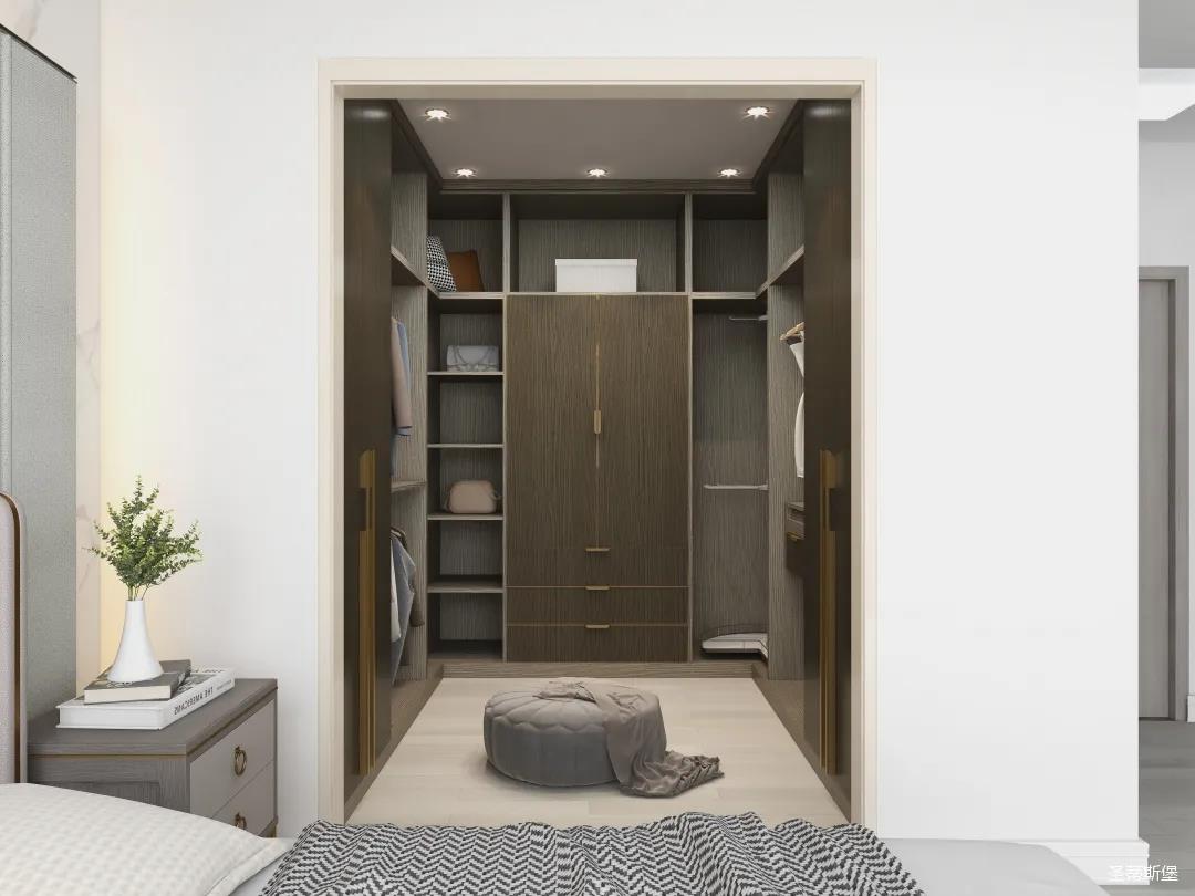 衣帽间进行u型设计,全落地定制形式,融汇了简奢风格独具的浪漫与优雅。金属、实木拼接细节与天然材质为衣帽间注入与众不同的高级气质!开放式的懒人布局,让衣物收纳一目了然,能同时满足叠放与挂衣功能,实现了“一柜多用”。