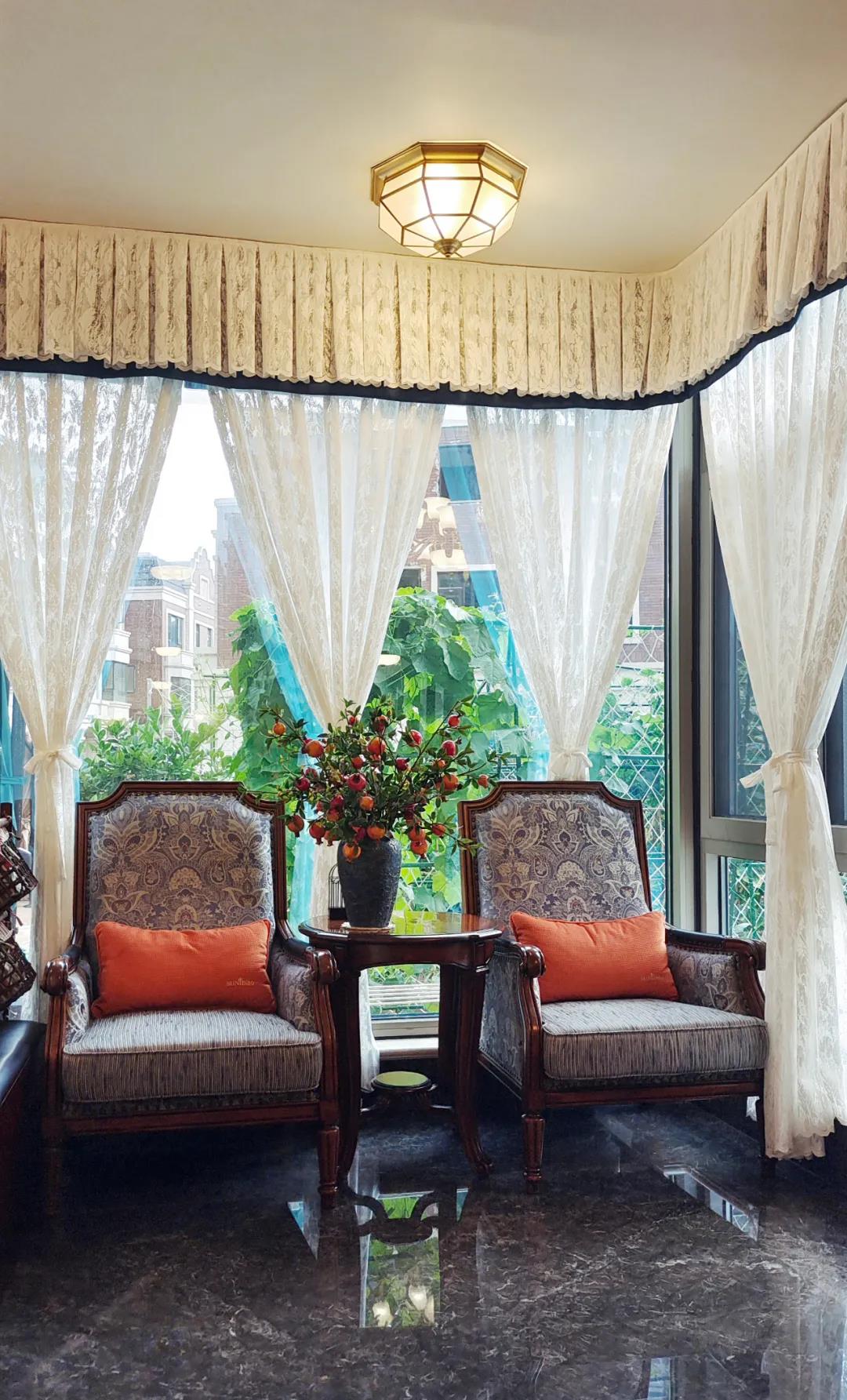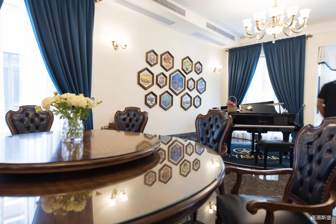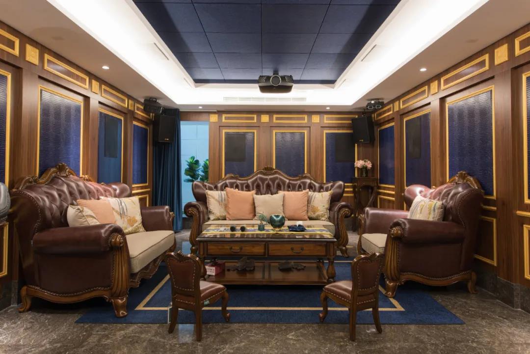 业主夫妇非常热情好客,平时工作之余也会在家里邀三两好友一起观影,观影室的整体设计容纳着浓烈的古色古香,长方形图案排列搭配复古的家具与配饰,精细的雕花艺术,于细节之间演绎着精致生活。不管时光如何辗转变换,家的定义从不曾改变,它抚慰着我们的心灵,承载着我们的喜乐,从细腻的质感中感知家的点滴变化,才是对生活最真实的写照。
