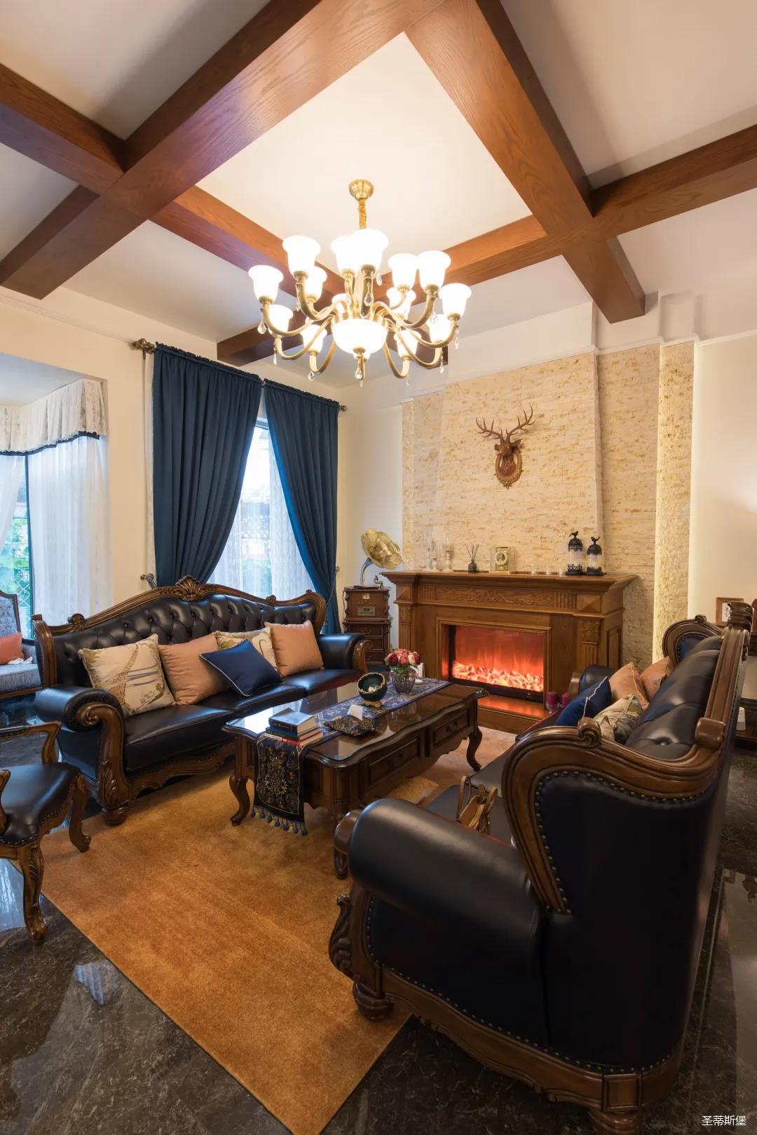 欧美实木吊顶设计,与沙发茶几上下呼应,相得益彰,提升了空间层次感。