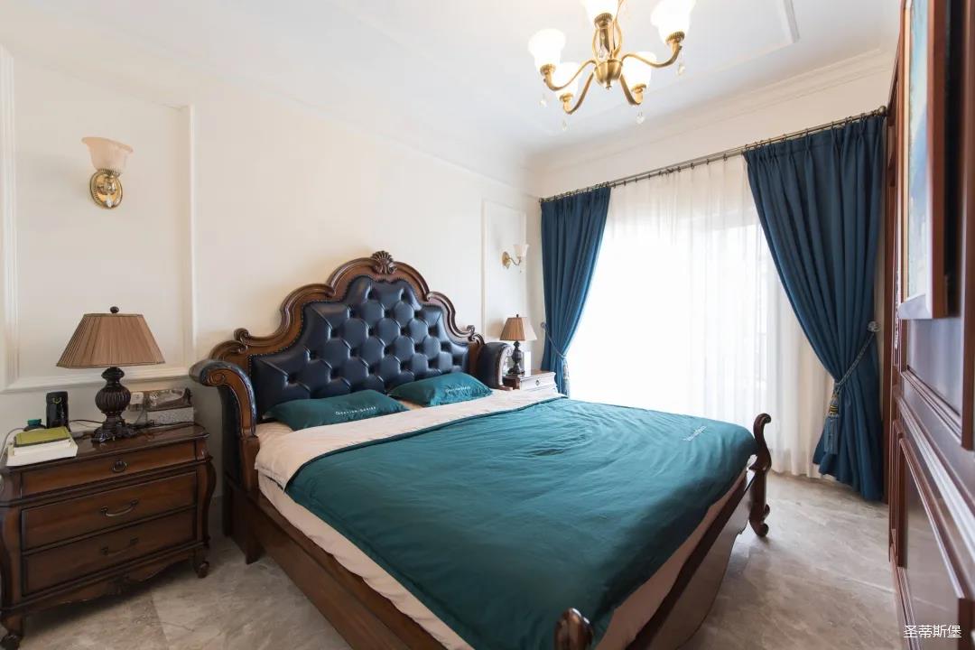 三楼是两间卧房,每一间卧室都有自己的特定属性。主人房端庄优雅,雍容尽显;墙面以简洁的美式石膏线修饰,波浪形的实木床屏上点缀着太阳形状的手工雕花,宛如海平面上刚出升的太阳,让整个空间色彩奔放。